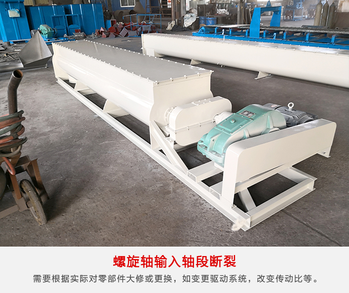 由于螺旋給料機安裝時,螺旋軸同軸度超差或選軸時安全系數偏低等引起,根據生產需要進行設備改造維護,當工藝變化,超出設備性能范圍時,繼續運行會造成設備快速損壞,甚至滿足不了生產工藝要求,影響正常生產。需要根據實際情況和現場條件,對零部件大修更換,如變更驅動系統,改變傳動比,提高備件材料性能或尺寸變化,直至更換設備。