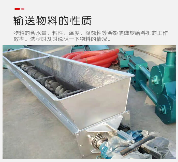 物料的含水量、粘性、溫度、腐蝕性等會影響螺旋給料機的工作效率,舉例來說,如含水量大,粘性強的物料在輸送過程中比較容易粘連在螺旋葉片上,會出現結塊現象,這樣會大大削減螺旋給料機的輸送效率和使用壽命,在選型的時候,用戶需要事先向廠家說明一下物料的情況,以便廠家為您推薦合適的型號。