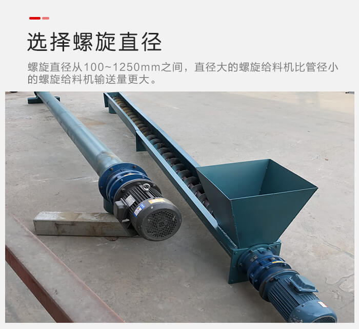 螺旋給料機螺旋直徑從100~1250mm之間,選擇不同的管徑對于單位時間輸送量是有直接的影響的,直徑大的螺旋給料機比管徑小的螺旋給料機輸送量更大。