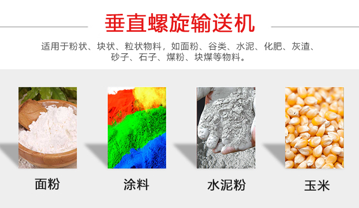垂直螺旋輸送機適用于粉狀、塊狀、粒狀物料,如面粉、谷類、水泥、化肥、灰渣、砂子、石子、煤粉、塊煤等物料。同時還可用于建材、冶金、化工、采掘、機械制造、煤灰、糧食、食品、等行業。