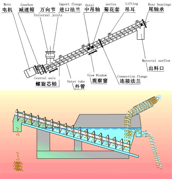 傾斜螺旋輸送機是利用電動機經減速器帶動螺旋回轉,通過旋轉,把物料沿固定的機殼內推移而進行輸送工作,從而輸送到預定的位置。 大角度螺旋輸送機根據各種用途、安裝位置,型號、輸送方式,對減速器、電動機的安裝位置可多樣化、不受限制。