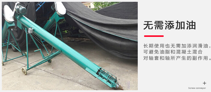 由于移動式螺旋輸送機采用了新穎的中間軸承材料,,既能減摩,耐磨又能自潤滑,即使長期使用也毋需加添潤滑油,可避免油脂和混凝土混合對軸套和軸所產生的副作用。