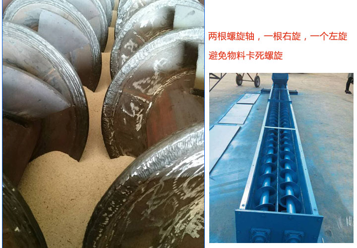 雙螺旋輸送機擁有兩根螺旋軸,旋轉方向相反(一根右旋,另一個左旋),能有效避免物料卡死螺旋,輸送中不會出現卡料和堵料的現象。