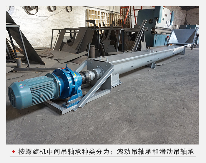 按螺旋機中間吊軸承種類分為:M1—為滾動吊軸承,采用80000型密封軸承,軸蓋上另有防塵密封結構,常用在不易加油,不加油或油對物料有污染的地方,密封效果好,吊軸承壽命長,輸送物料溫度≤80℃(訂貨時可不注明)。M2—為滑動吊軸承,設防塵密封裝置,常用在輸送物料溫度比較高(>80℃),或輸送液狀物料