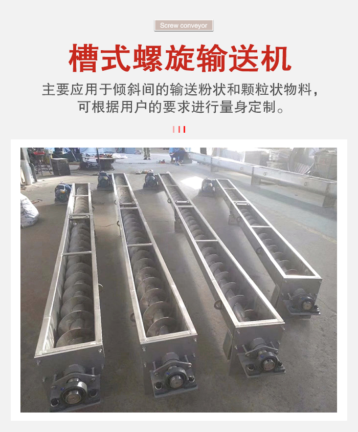 槽式螺旋輸送機又稱螺旋給料機,主要應用于傾斜間的輸送粉狀和顆粒狀物料,可根據用戶的要求定制成不同直徑,不同長度,不同傾斜度,并可配套安裝調速電機,已連續的調節轉速,達到定量給料的目的。