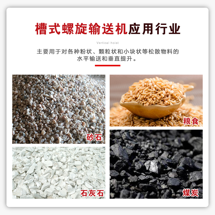 槽式螺旋輸送機是農業各部門]機械化運輸工作的主要機組,可使運輸工作減輕勞動強度,提高工作效率,應用范圍很廣。槽式螺旋輸送機適用于各行業,如建材、化工、電力、冶金、煤炭、糧食等行業,適用于水平或傾斜輸送粉狀、粒狀和小塊狀物料,如煤、灰、渣、水泥、糧食等。