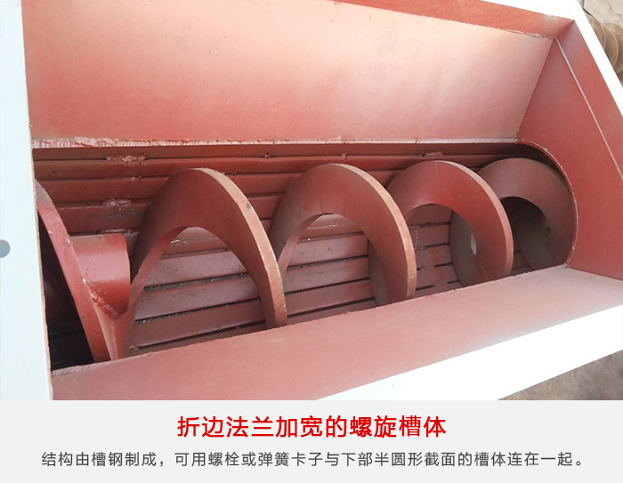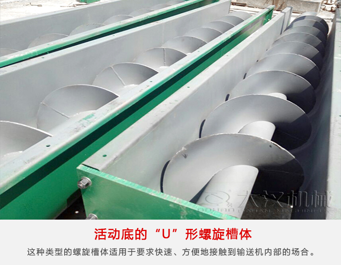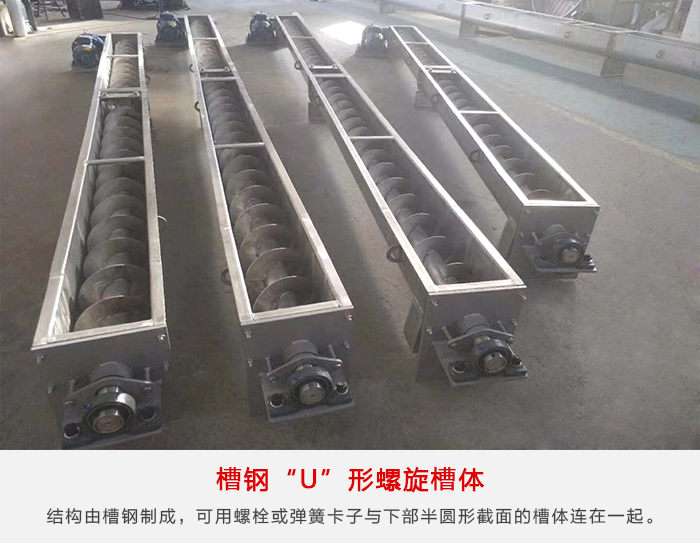 槽鋼“U”形螺旋槽體適用于輸送機支承間距要求長的場合。槽體的上邊由結構槽鋼制成,可用螺栓或彈簧卡子與下部半圓形截面的槽體連在一起。