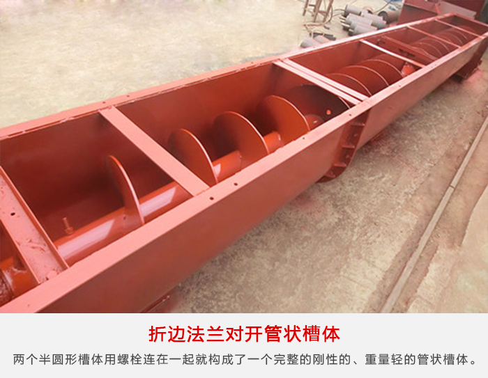 煤粉螺旋輸送機這種形式的槽體類似于角鐵法蘭槽體,但法蘭是由半圓形槽體的同一塊鋼板橋邊加工制成,兩個半圓形槽體用螺栓連在一起就構成了一個完整的剛性的、重量輕的管狀槽體。