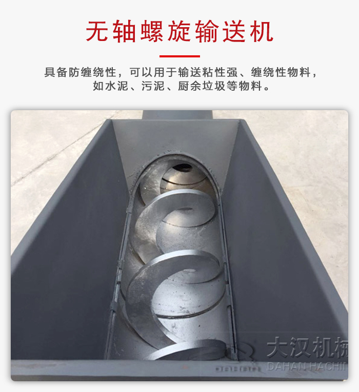 無(wú)軸螺旋輸送機(jī)采用了無(wú)中心軸設(shè)計(jì),具備防纏繞性,可以用于輸送粘性強(qiáng)、纏繞性物料,如水泥、污泥、廚余垃圾等物料,可水平、傾斜輸送(傾斜角度不超過(guò)20°),大漢無(wú)軸螺旋輸送機(jī)可分為單無(wú)軸和雙無(wú)軸螺旋輸送機(jī),還可根據(jù)輸送物料及應(yīng)用場(chǎng)合分為碳鋼、不銹鋼材質(zhì)。
