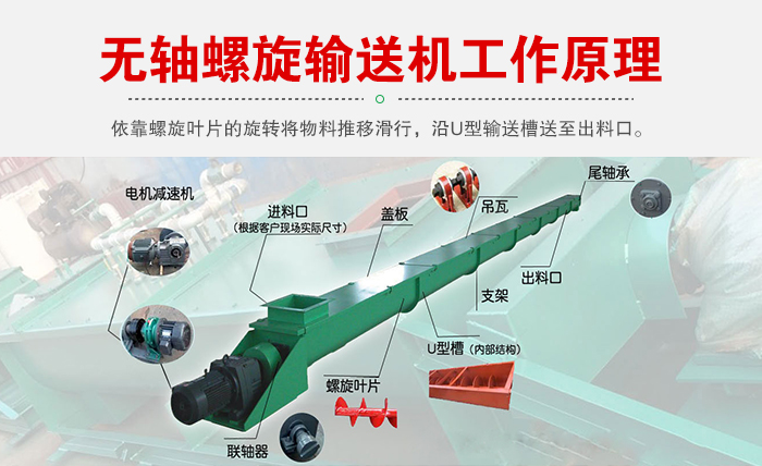 無(wú)軸螺旋輸送機(jī)由驅(qū)動(dòng)機(jī)構(gòu)(電機(jī)減速機(jī)、傳動(dòng)軸)、U型槽與支架、無(wú)軸螺旋、襯條、蓋板、進(jìn)料口、出料口、緊固件等部件組成。當(dāng)物料從輸送機(jī)的進(jìn)料口進(jìn)入,依靠螺旋葉片的旋轉(zhuǎn)將物料推移滑行,沿U型輸送槽送至出料口,并與壓榨機(jī)或垃圾小車配套,將物料進(jìn)行下一步處理。
