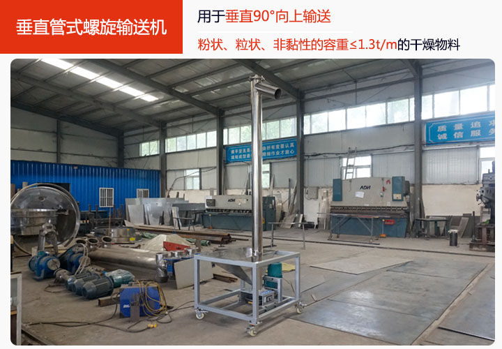 垂直管式螺旋輸送機(jī)適合垂直90°向上輸送物料,能輸送粉狀、粒狀、非黏性的容重≤1.3t/m的干燥物料。垂直管式螺旋輸送機(jī)的輸送過程依靠的是物料與機(jī)殼之間的摩擦力進(jìn)行物料的輸送,進(jìn)料口到出料口之間的距離從2.5米起到15米止,0.5米為一檔,用戶可根據(jù)需要選用,大漢垂直管式螺旋輸送機(jī)材質(zhì)分為兩種:碳鋼與不銹鋼,碳鋼的比較適用于一般的物料的提升,不銹鋼材質(zhì)的主要用于食品行業(yè)與化工行業(yè)的使用。