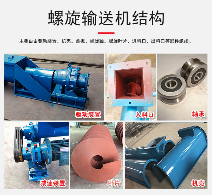 主要由由驅(qū)動(dòng)裝置,機(jī)殼、蓋板、螺旋軸、螺旋葉片、進(jìn)料口、出料口等部件組成。
