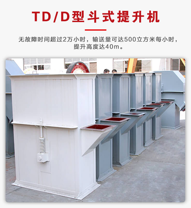 TD型斗式提升機由運行部分料斗與牽引膠帶、帶有傳動滾筒的 上部區(qū)段,帶有拉緊滾筒的下部區(qū)段,中間機殼,驅(qū)動裝置,逆止制動裝置等組成。無故障時間超過2萬小時,輸送量可達(dá)500m3/h,提升高度達(dá)40m。