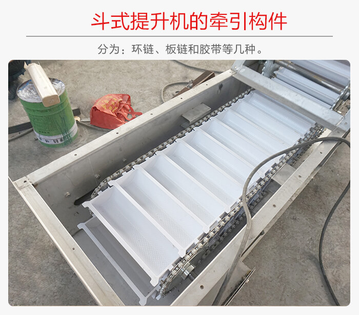 環(huán)鏈的結(jié)構(gòu)和制造比較簡單,與料斗的連接也很牢固,輸送磨琢性大的物料時,鏈條的磨損較小,但其自重較大。板鏈結(jié)構(gòu)比較牢固,自重較輕,適用于提升量大的提升機,但鉸接接頭易被磨損,膠帶的結(jié)構(gòu)比較簡單,但不適宜輸送磨琢性大的物料,普通膠帶物料溫度不超過60°C,夾鋼繩膠帶允許物料溫度達(dá)80°C,耐熱膠帶允許物料溫度達(dá)120°C,環(huán)鏈、板鏈輸送物料的溫度可達(dá)250°C。