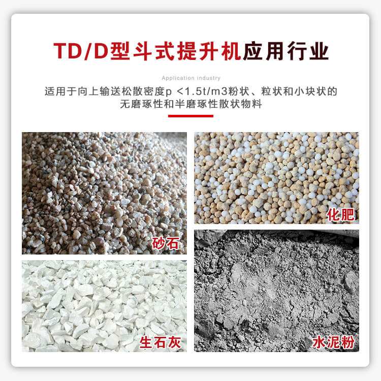 應(yīng)用行業(yè):TD型斗式提升機適用于向上輸送松散密度p <1.5t/m3粉狀、粒狀和小塊狀的無磨琢性和半磨琢性散狀物料 ,如煤、砂、焦末、水泥、碎礦石等。