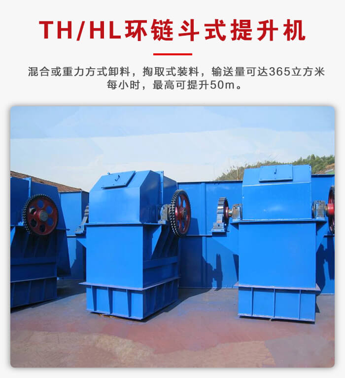 TH/HL環(huán)鏈斗式提升機牽引機構(gòu)是兩根環(huán)形鏈條,為混合或重力方式卸料,掏取式裝料,輸送量可達(dá)365m3/h,最高可提升50m。