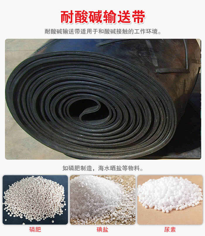 耐酸堿輸送帶適用于和酸堿接觸的工作環境,如磷肥制造,海水曬鹽,覆蓋膠采用橡塑共混并填充算堿性優異的性情材料, 比氯丁橡膠耐酸堿輸送帶耐酸堿性能更優。