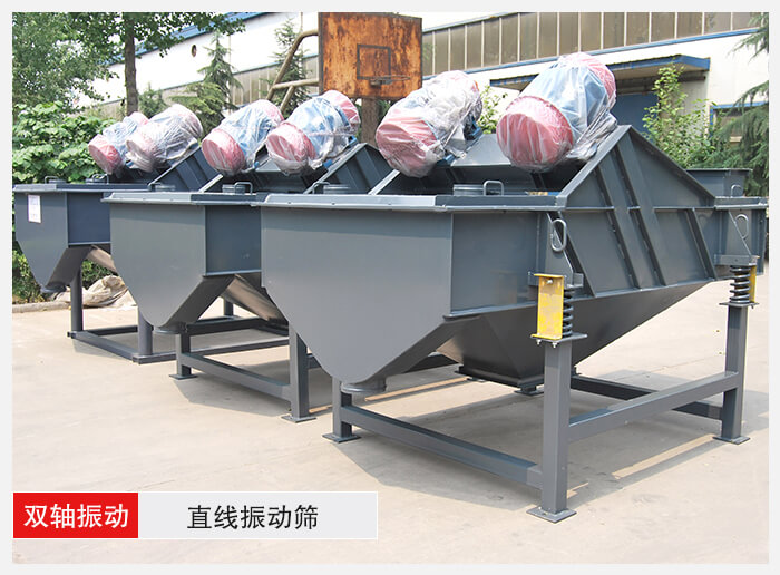 雙軸振動篩是利用同步異向回轉(zhuǎn)的雙不平衡重激振,篩面水平或緩傾斜,篩箱的運動軌跡為直線。